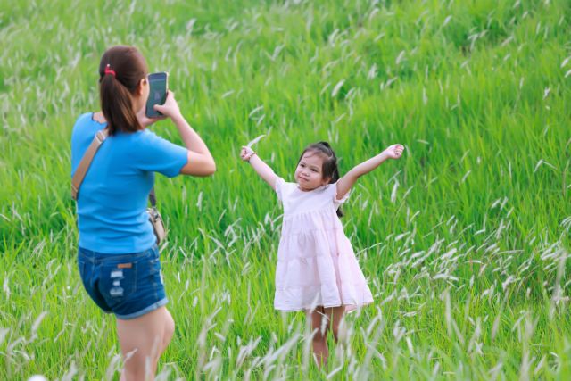 | A mother takes her daughter’s photo among tall grass along Ngọc Thụy Dyke, Long Biên District. |