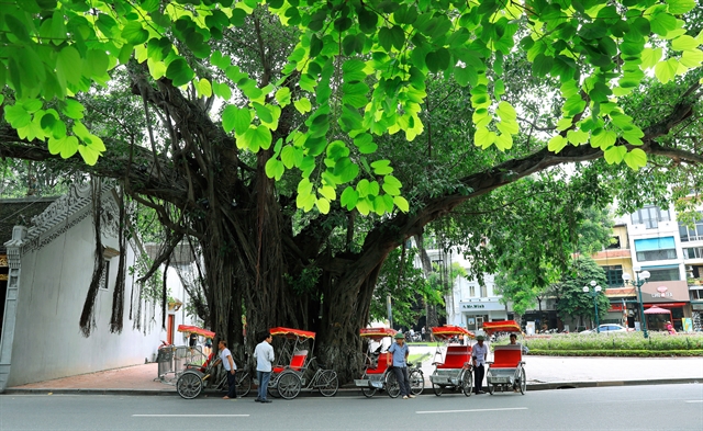 | Cyclo drivers on Đinh Tiên Hoàng Street waiting for foreign tourists to take around Hoàn Kiếm Lake, viewing and enjoying nice weather in Hà Nội autumn. |