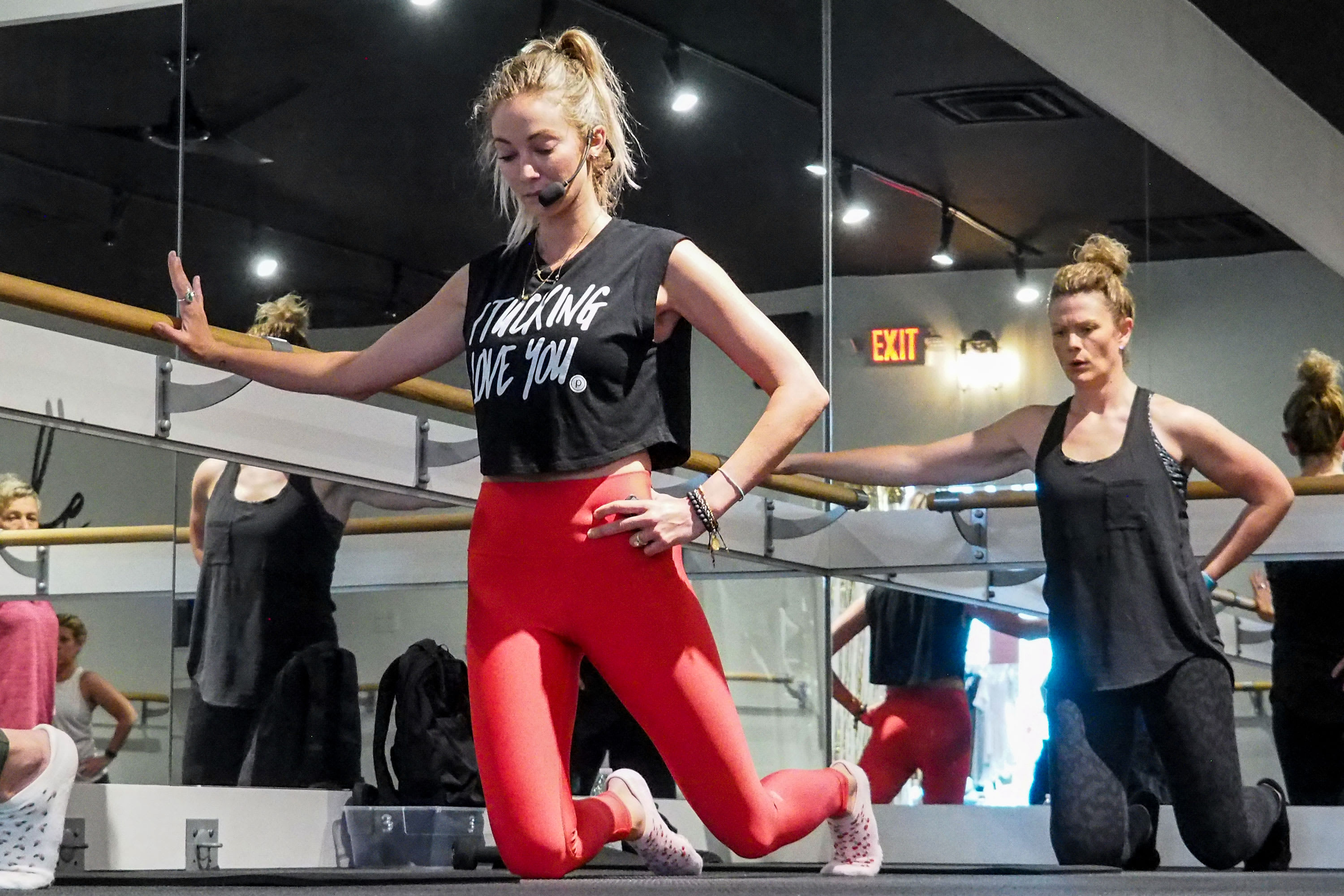 Owner Sarah Celek (red leggings) teaches a class at Pure Barre Cincinnati West as Ohio gyms and fitness centers reopen for business in the wake of the Coronavirus COVID-19 pandemic in Cincinnati, Ohio.