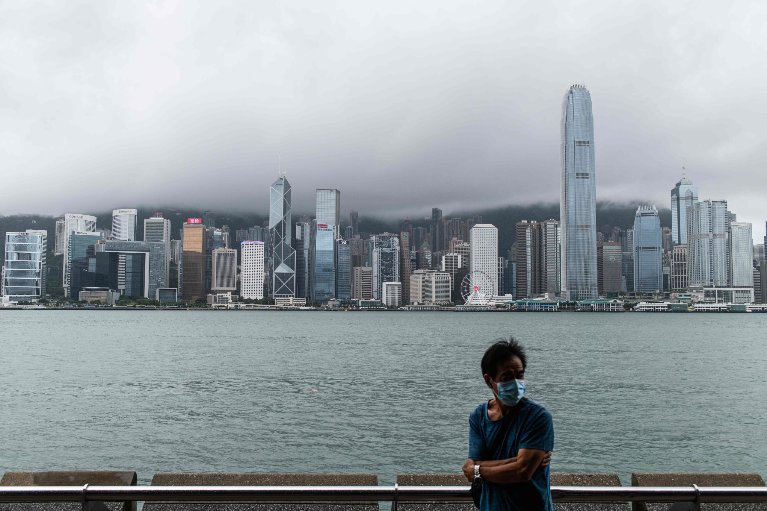 A man wearing a protective face mask stands on Kowloon’s Tsim Sha Tsui waterfront that faces Victoria Harbour in Hong Kong.