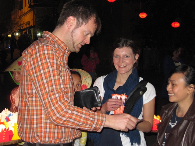 | Foreign tourists enjoy releasing candle-lit paper flowers on the Hoài River of Hội An. — VNS Photo Công Thành |