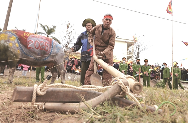 | RE-ENACTMENT: Nguyễn Ngọc An, 75 years old, residing in Tiên Sơn Commune, Duy Tiên Town, Hà Nam Province) portrays King Lê Đại Hành ploughing the first furrow of the year alongside farmers. VNA/VNS Photos Trần Việt |