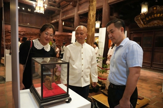 | Visitors view an agarwood artwork displayed at the event. — Photo courtesy of the Centre for Cultural and Scientific Activities – Văn Miếu – Quốc Tử Giám |