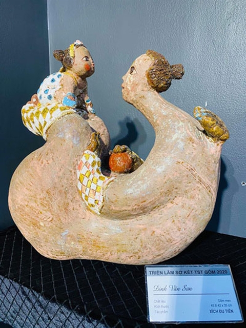 The sculpture Xích Đu Tiên (Magic Love) by Đinh Văn Sơn at an exhibition featuring 120 sculptures by 26 artists of the Sài Gòn Club of Ceramic Art at the HCM City Fine Arts Association. Photo courtesy of the association