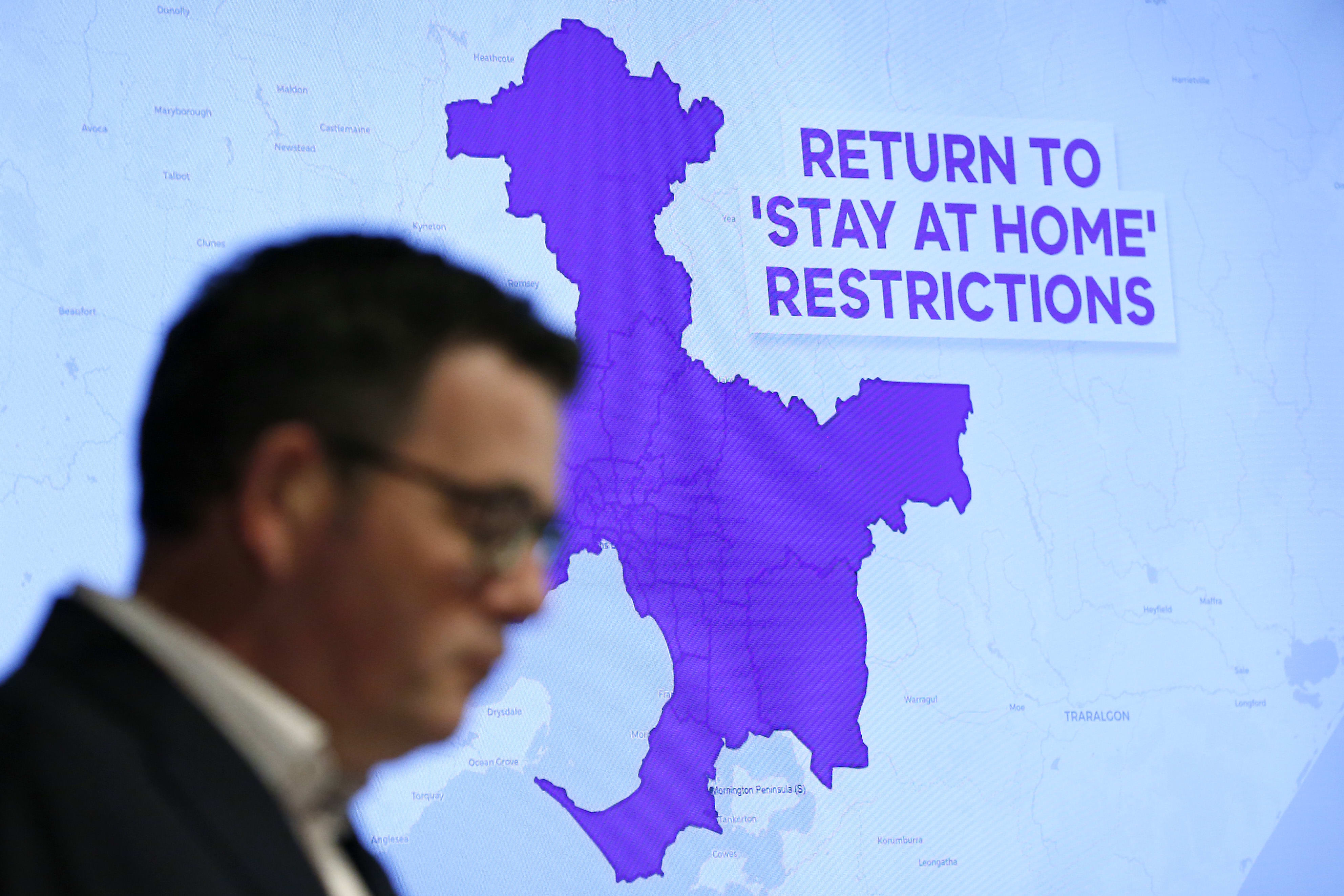 A graphic is seen showing the areas of Melbourne that will be required to go into lock down as Victorian Premier Daniel Andrews speak to the media on July 07, 2020 in Melbourne, Australia.