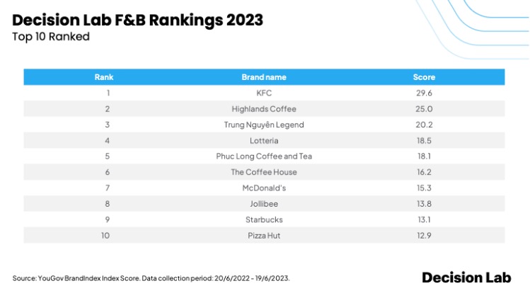 Decision F&B Rankings 2023 has named KFC (29.6) as the best F&B brand in Vietnam, followed by Highland Coffee (25.0) and Trung Nguyen Legend (20.2).
