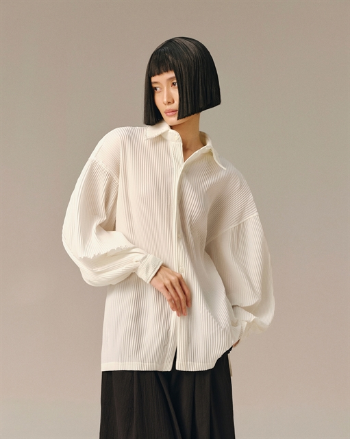 | Môi Điên’s signature unisex pleated shirt. Photo courtesy of Môi Điên |