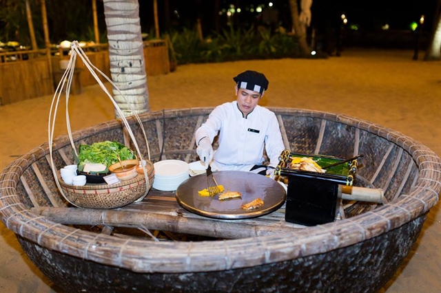 | A chef cooks seafood on a coracle on the beach of Đà Nẵng. Pristine white sand beaches in central Việt Nam lure visitors from Taiwan and Korea. — Photo courtesy of Đà Nẵng City’s Tourism Promotion Centre |
