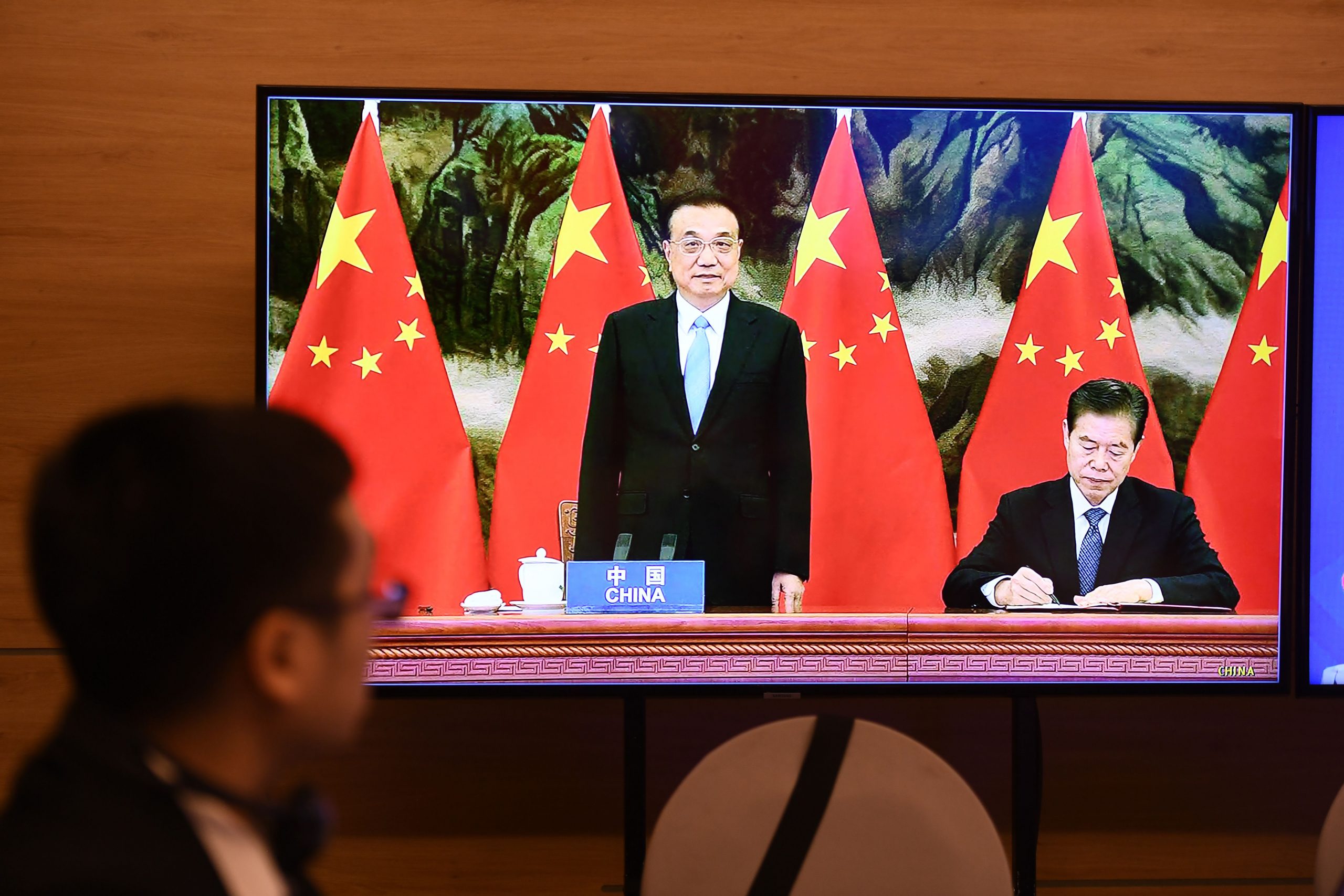 China’s Premier Li Keqiang (center) looks on as Chinese Minister of Commerce Zhong Shan (right) signs the massive trade agreement, as seen on a TV monitor, during the ceremony for the Regional Comprehensive Economic Partnership (RCEP) trade pact at the ASEAN summit that was held online on Nov. 15, 2020.