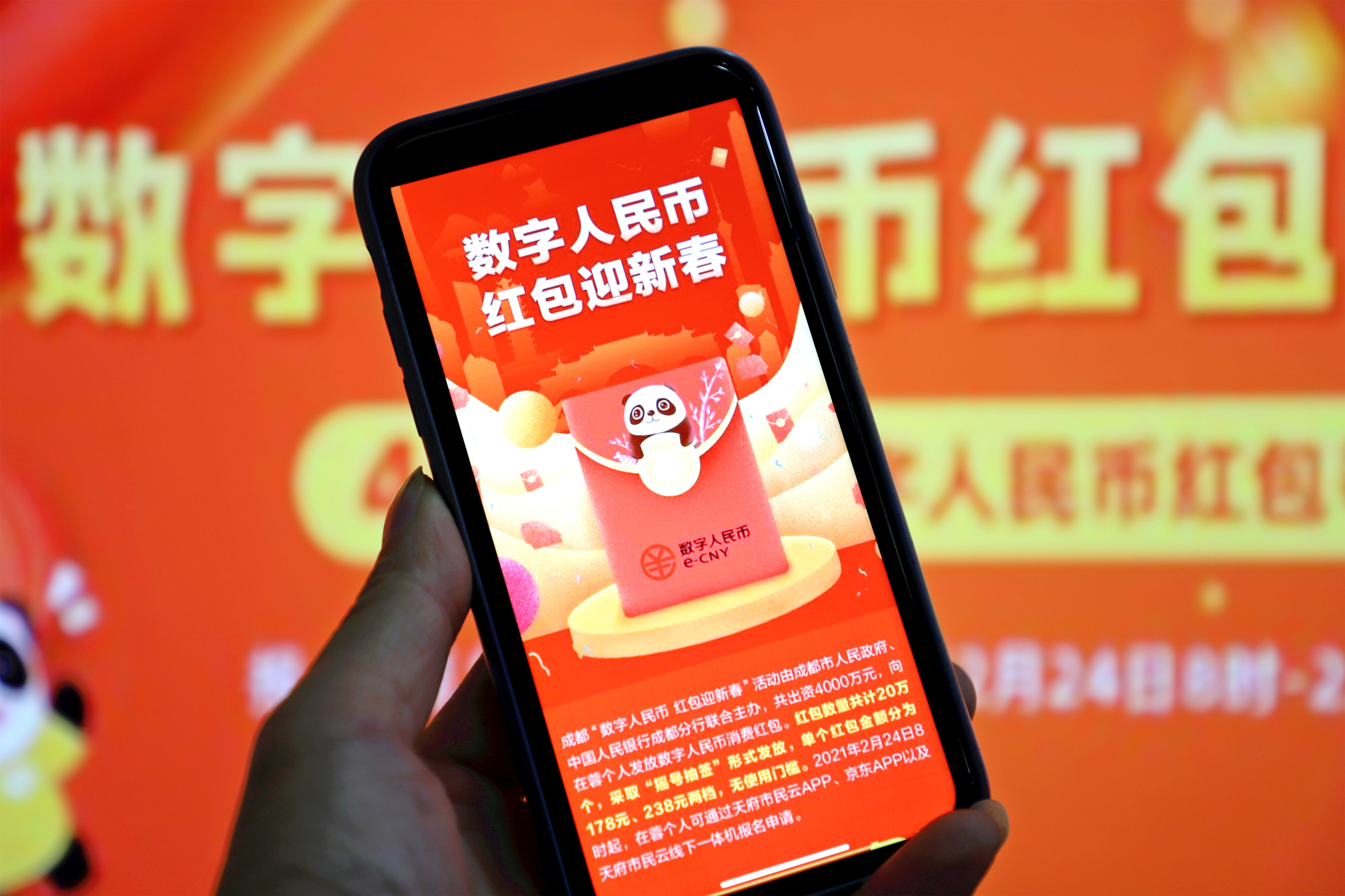 A digital Chinese currency red packet is seen on a mobile phone in an arranged photograph as Chengdu city starts to distribute 200,000 E-CNY ‘red packets’ worth 40 million yuan on February 24, 2021 in Yichang, Hubei Province of China.