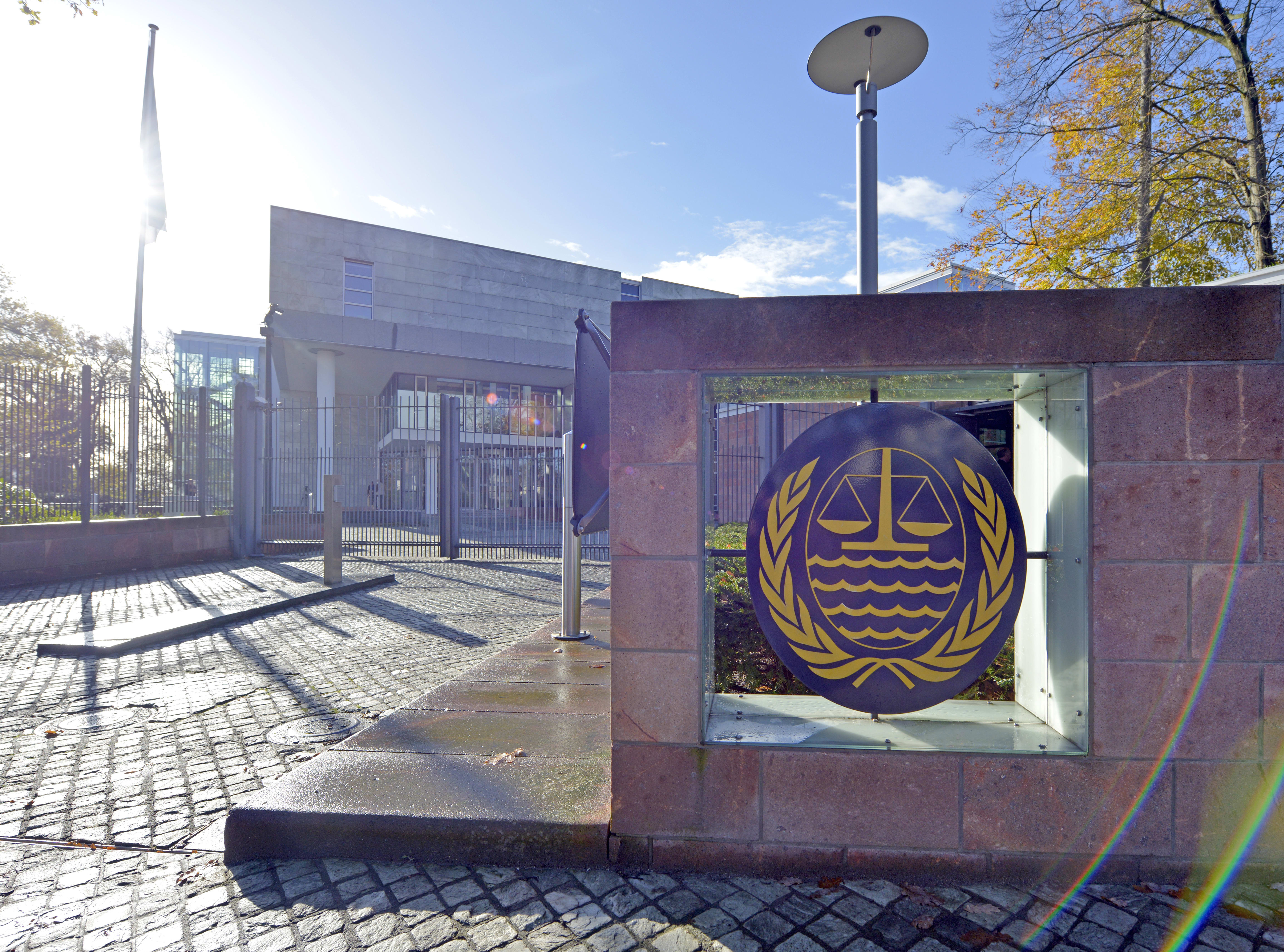 The emblem of the International Tribunal for the Law of the Sea (ITLOS) at the court’s entrance in Hamburg, Germany.