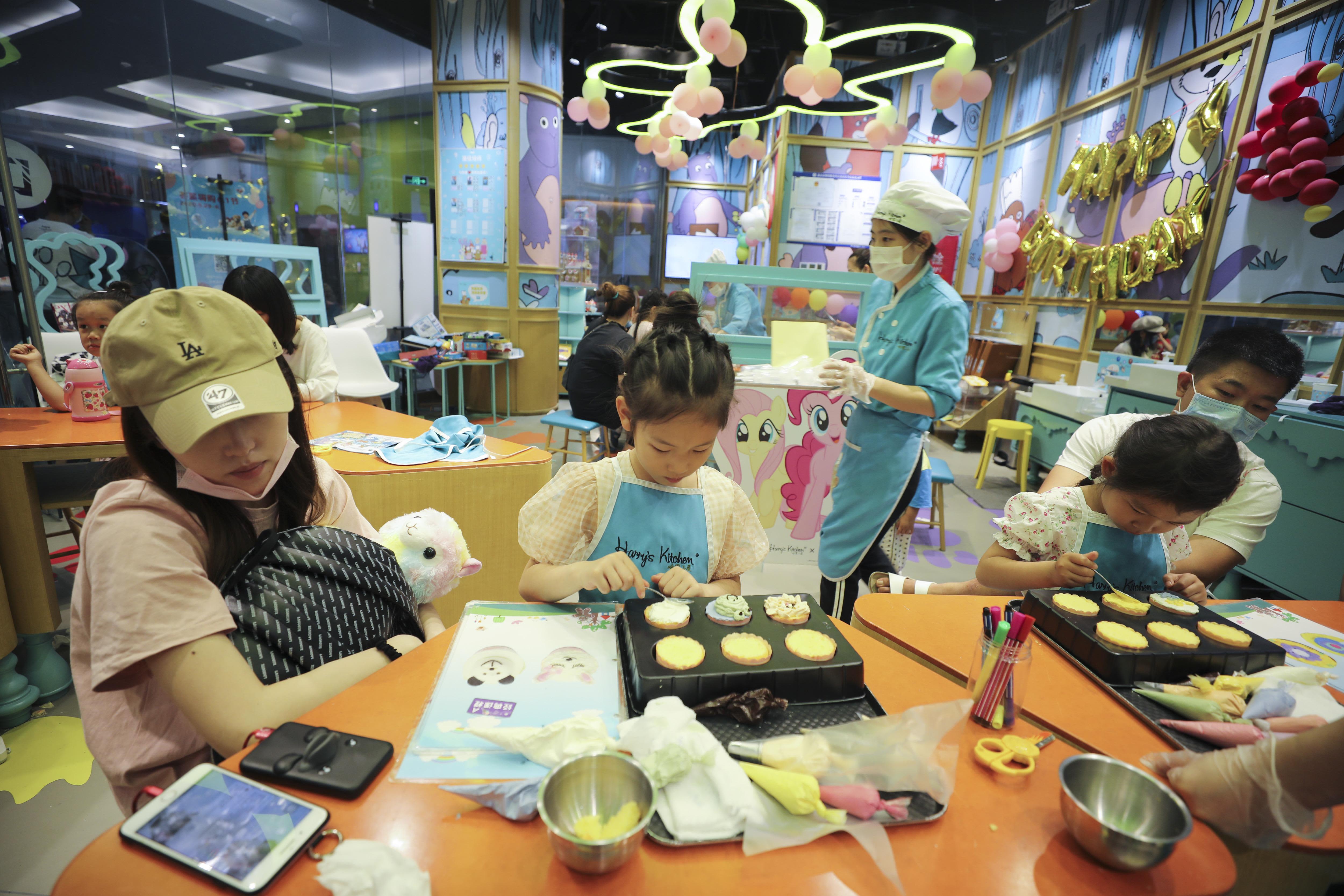 China’s shopping malls increasingly feature activity centers similar to this one in Beijing, where kids make cakes on Children’s Day on June 1, 2020.