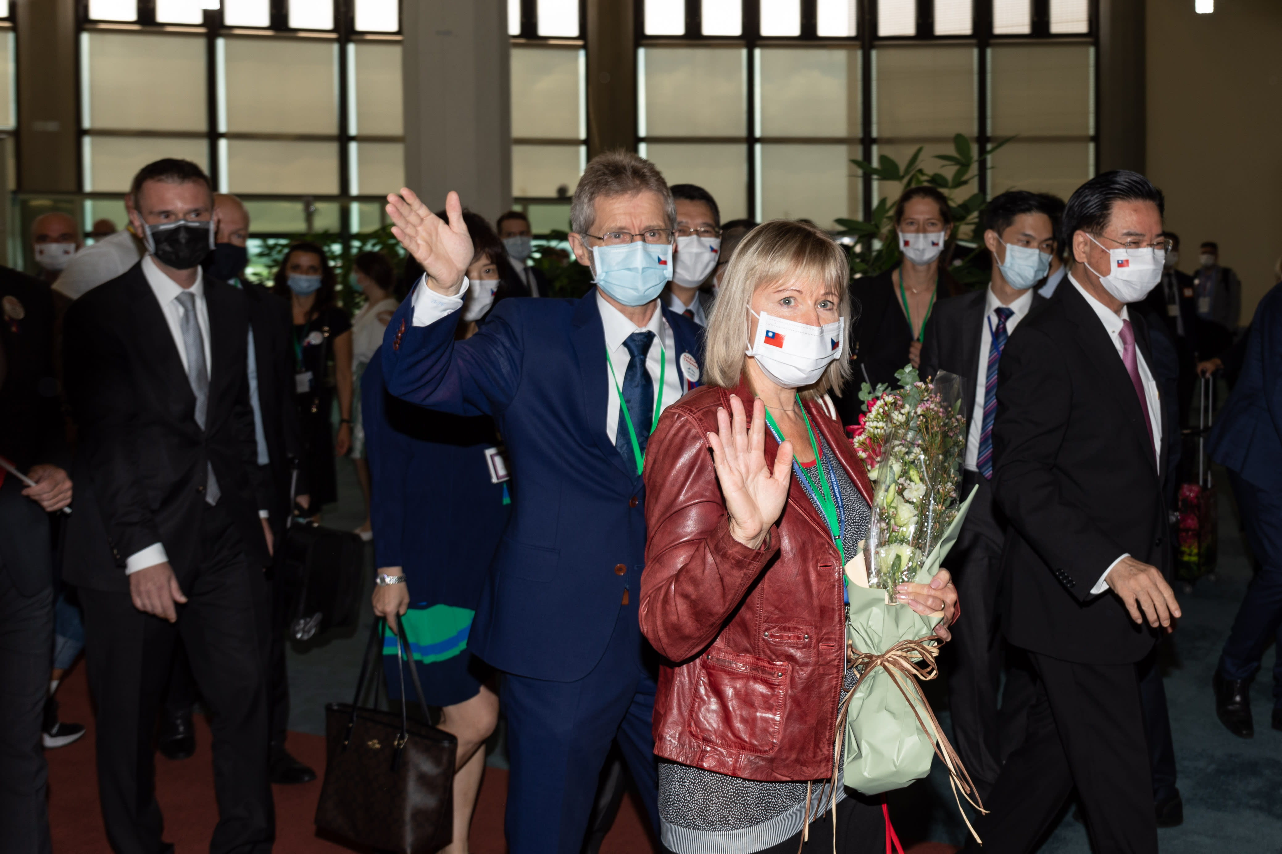 The Czech senate’s Milos Vystrcil and his wife wave to salute the press in Taipei, Taiwan, on August 30, 2020.
