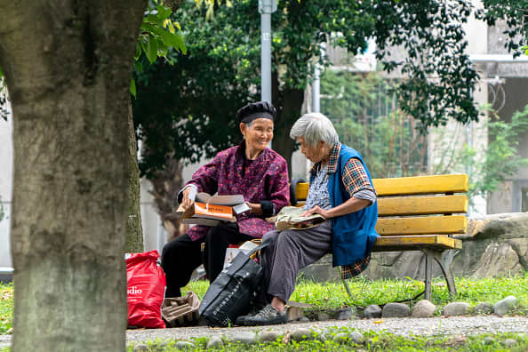 Two elderly women sit on a roadside bench in China. By 2050, one third of the Chinese population will be above 60 years old.