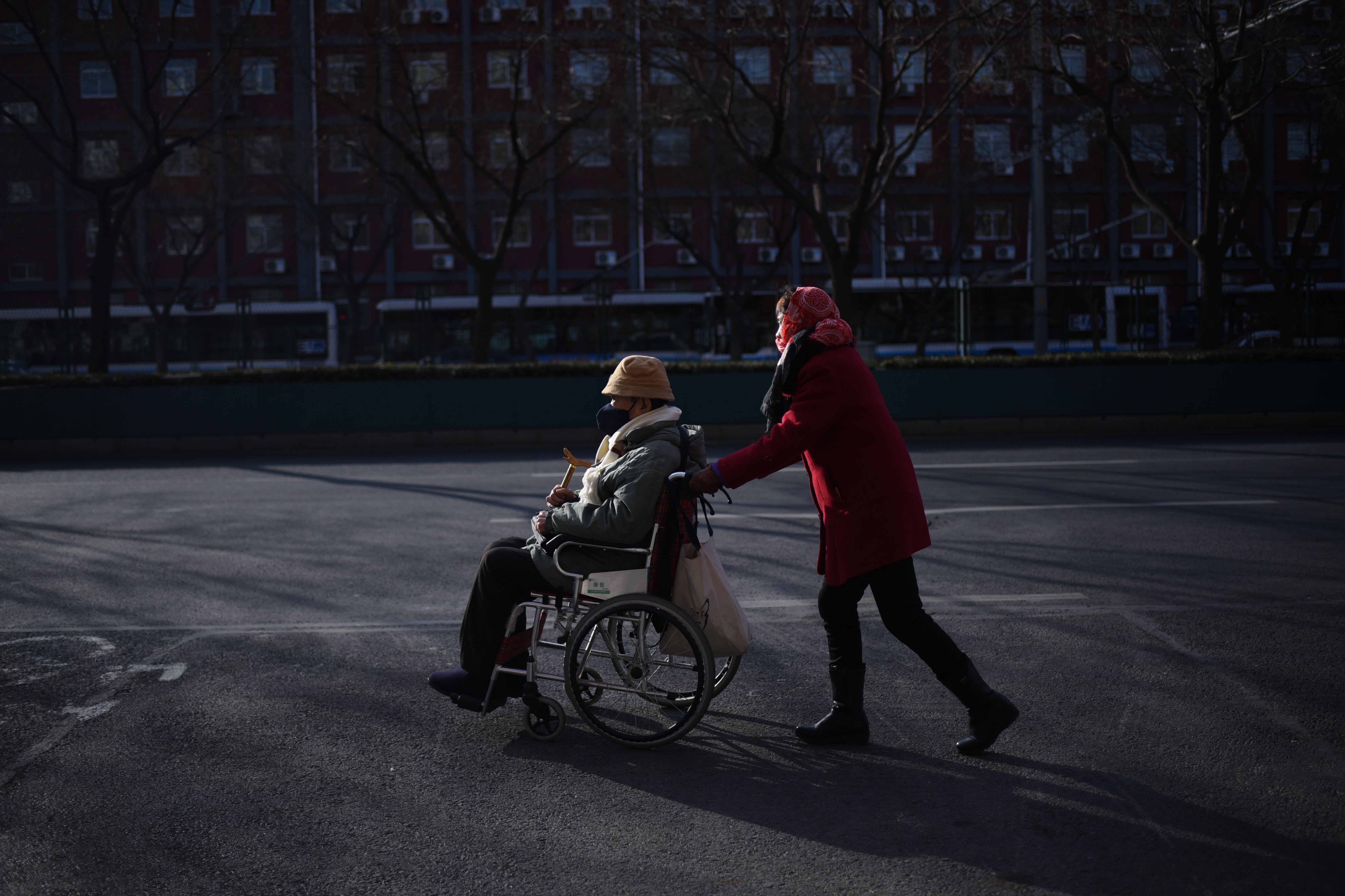 A man is pushed in a wheelchair along a street in Beijing.