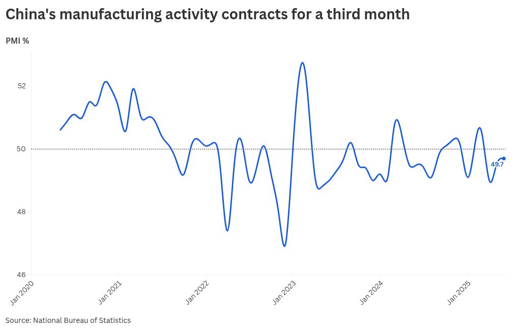 The official purchasing managers’ index (PMI) improved slightly to 49.7 in June from 49.5 in May but stayed below the 50-benchmark separating expansion from contraction, according to data from the National Bureau of Statistics. That figure was in line with analysts’ forecasts in a Reuters poll.