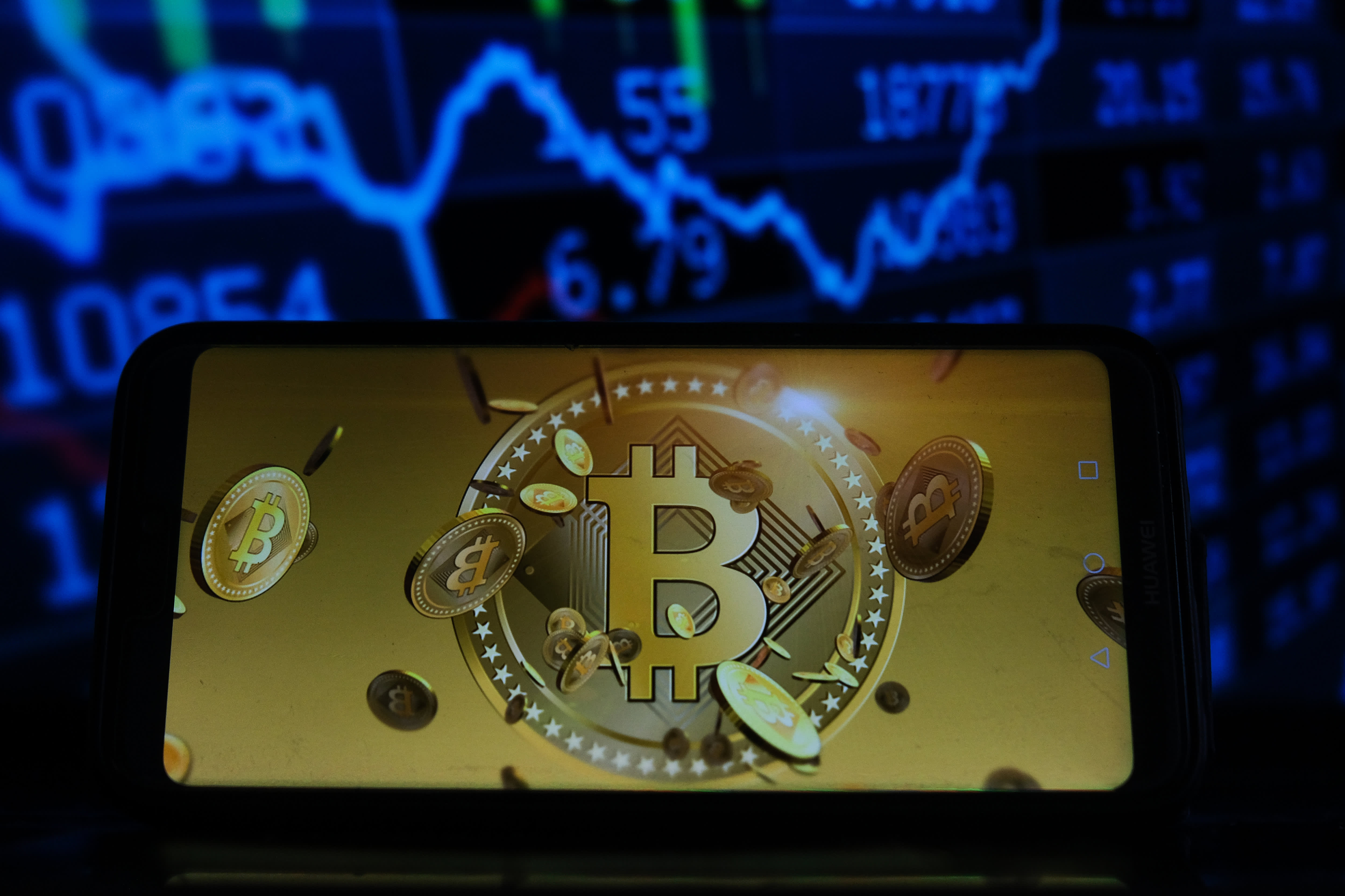 In this photo illustration a Bitcoin logo seen displayed on a smartphone with stock market percentages in the background.