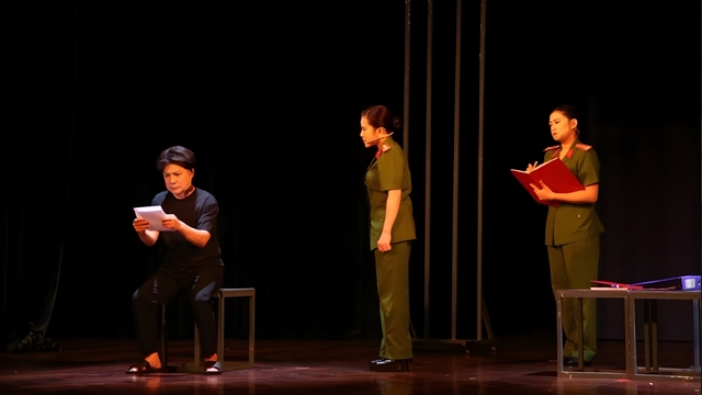 | TOUGH COP – Actress Bình Tinh plays a female police officer in the play. Photo courtesy of the theatre |