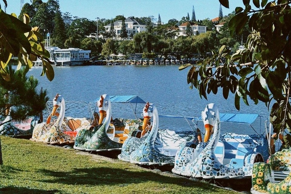 The pedalo activity on Xuan Huong Lake has been a popular, family-friendly attraction for nearly 30 years, especially for families with children or groups of friends. Participants use their feet to pedal, similar to cycling, steering the boat to the center of the lake to take in the scenery and enjoy the cool breeze. There are small pedal boats for two people and larger ones for five, with all passengers required to wear life vests.