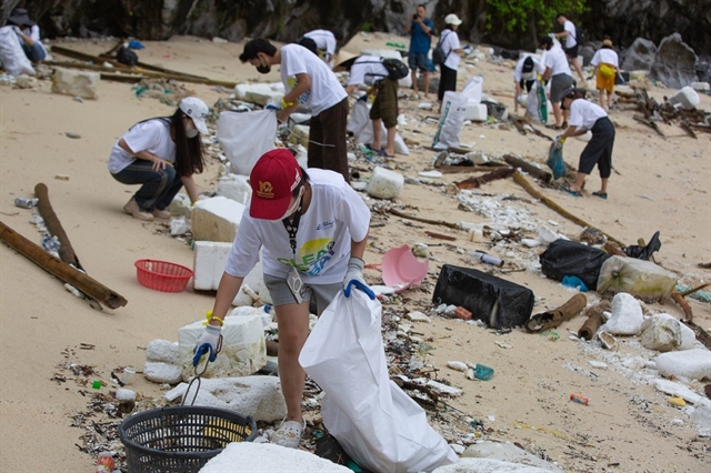 | Volunteers, including university students and representatives from tour operators and environmental organizations, collected rubbish on a beach in Hạ Long Bay, a UNESCO-recognised World Heritage site. This effort was part of the ‘Clean the Bay’ initiative, which aims to raise community awareness about environmental protection. — Photo courtesy of Bhaya Cruises |