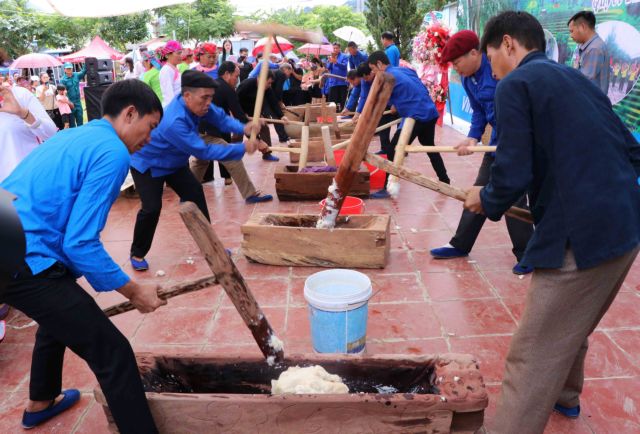 During the festival, the Giáy people wear traditional costumes and join in various folk games and competitions such as pounding sticky rice cakes.