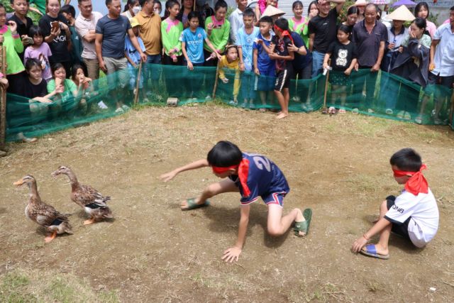 | Giáy children join the game of blindfolded catching ducks at the Háu Đoong Festival. VNA/VNS Photo Nguyễn Oanh |