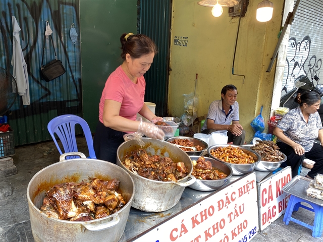 Northern-style stewed fish is offered in three shops located next to one another on Cầu Gỗ Street, which used to host Hàng Bè Market.