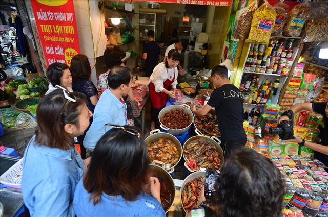 Three stewed fish shops located next to one another on Cầu Gỗ Street. VNS Photo Hoàng Nam