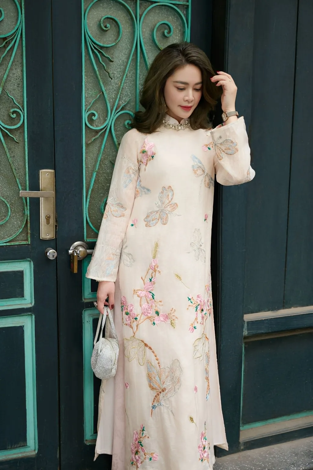 Minh has infused the nostalgic beauty of ancient Hà Nội during Tết into her designs for the upcoming Lunar Year of the Snake. Notably, she employs traditional embroidery techniques such as sequin embroidery and raised leaf vein embroidery to create sharp patterns on feminine puff-sleeved dresses and elegant áo dài.