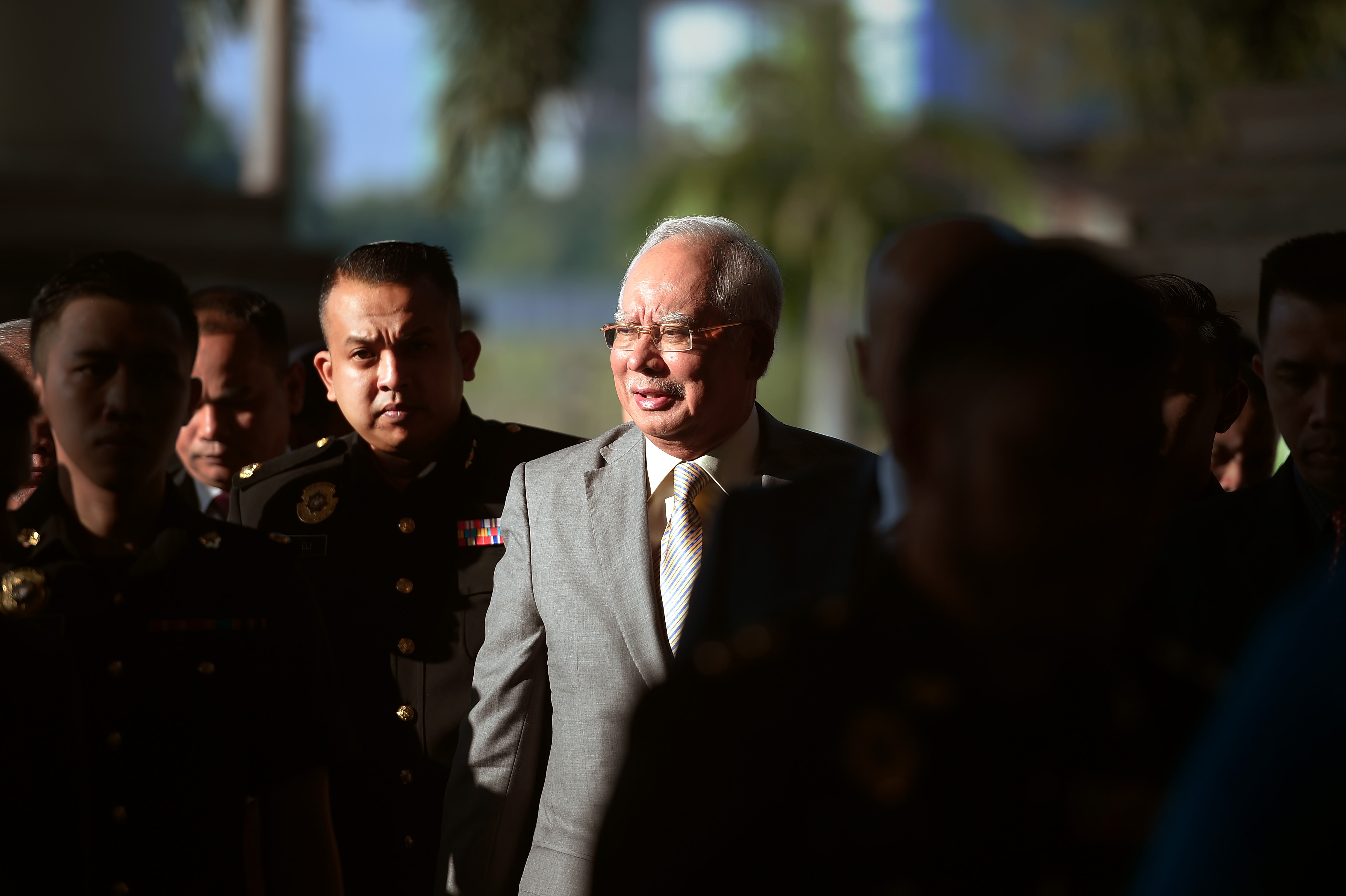 Former Malaysian Prime Minister Najib Razak (C) is escorted by police to a courthouse in Kuala Lumpur on Oct. 25, 2018.