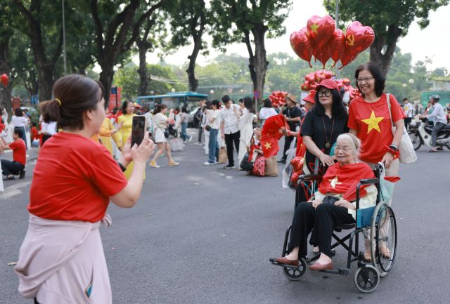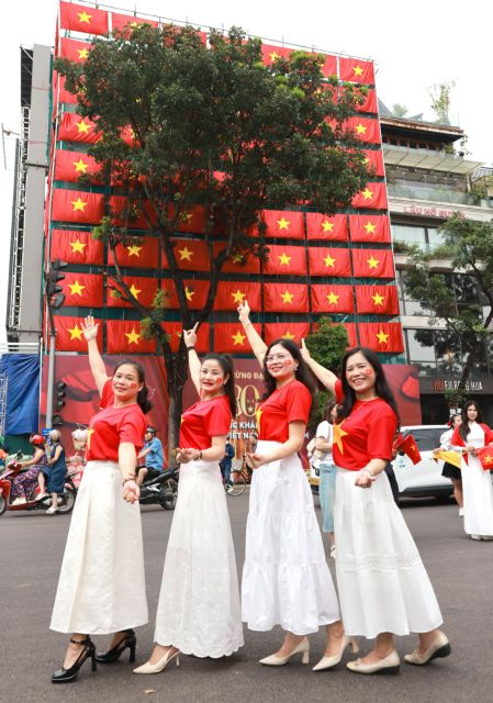 Many choose to wear white and red áo dài (traditional long dress), accessorised with symbols of patriotism such as the red flag with a yellow star, conical hats and scarves. Some even don vibrant national costumes that stand out.