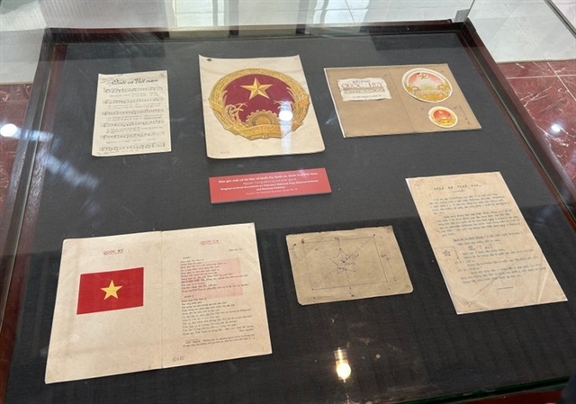 | Original documents of the National Flag, National Anthem, National Emblem, and Constitution are on display. — Photo nhandan.vn |