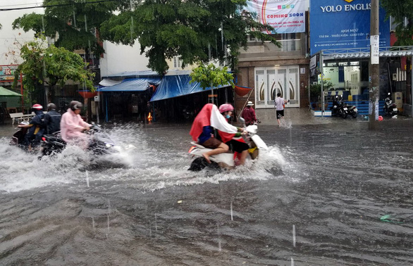 The cooling rain lasted for an hour, causing some roads to be flooded, many vehicles stalled in the middle of the road. Many people had to soak in the rain and drive their cars through the flooded road.