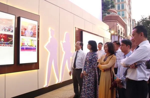 | Delegates from the HCM City government view the exhibition titled “Under the Party’s Flag – Vibrant City Named after President Hồ Chí Minh” at the newly opened HCM City Photography Street in Đồng Khởi Street in Sài Gòn Ward. — VNA/VNS Photo Thu Hương |