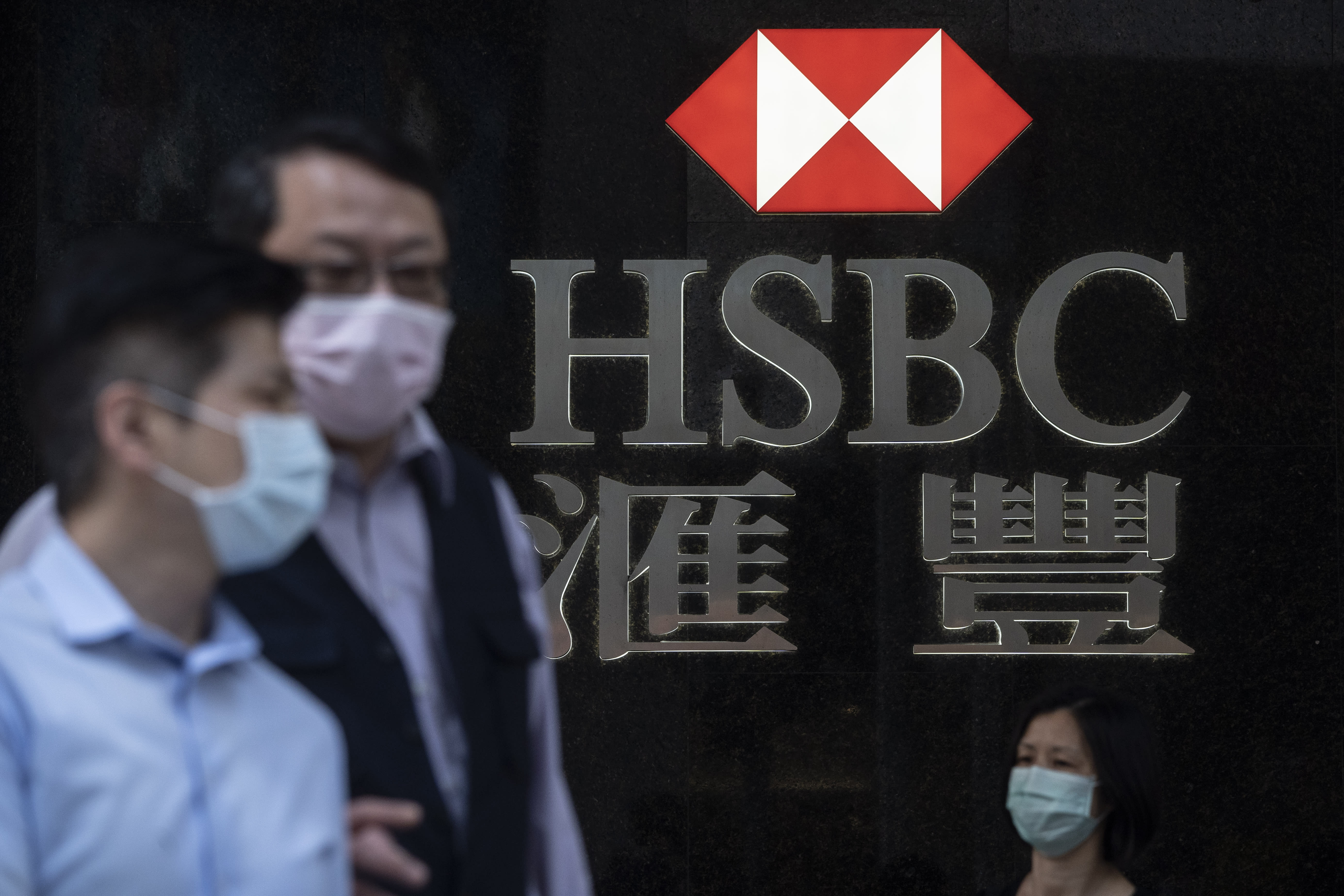 Pedestrians wearing protective masks walk past a logo displayed at a HSBC bank branch in the central district of Hong Kong.