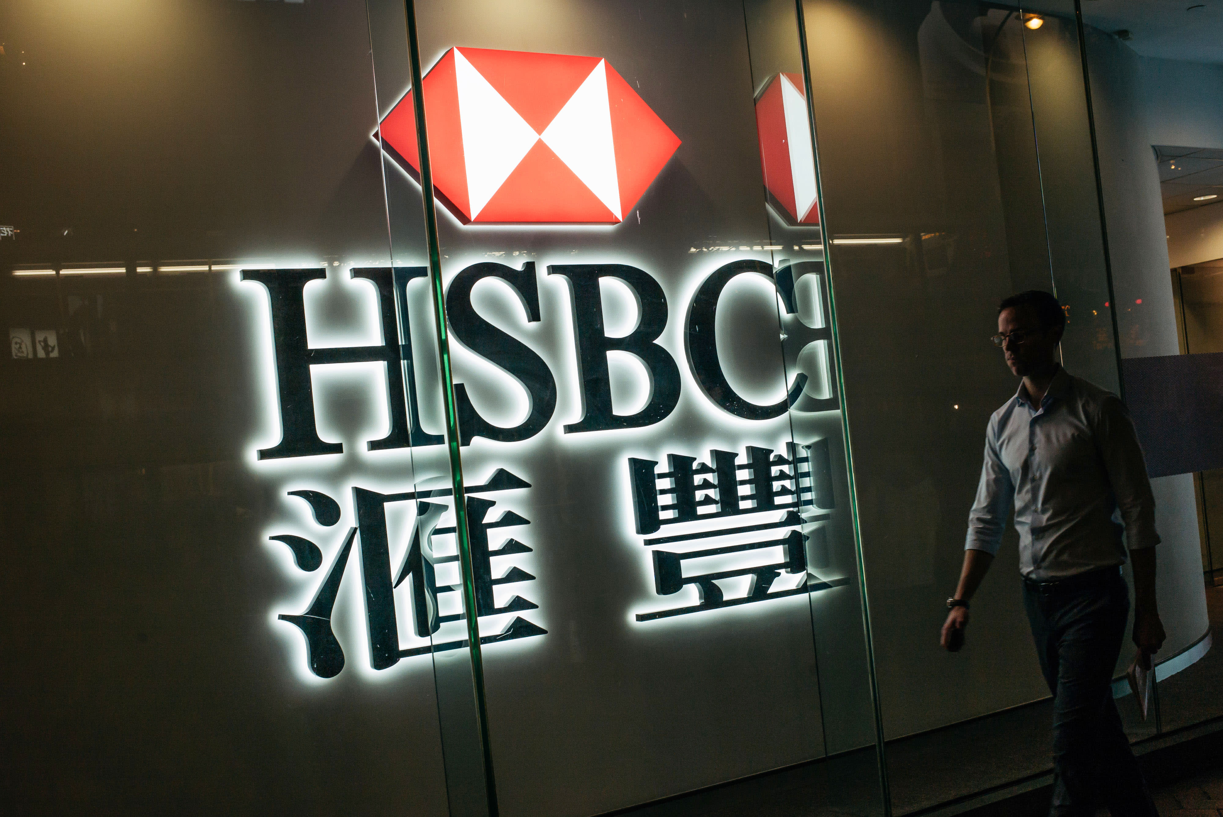 A pedestrian walks past illuminated signage for HSBC Holdings Plc displayed outside a bank branch in the Central district of Hong Kong, China.