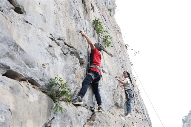 | Tourists take part in a mountain climbing class when visiting Hữu Liên Commune. |