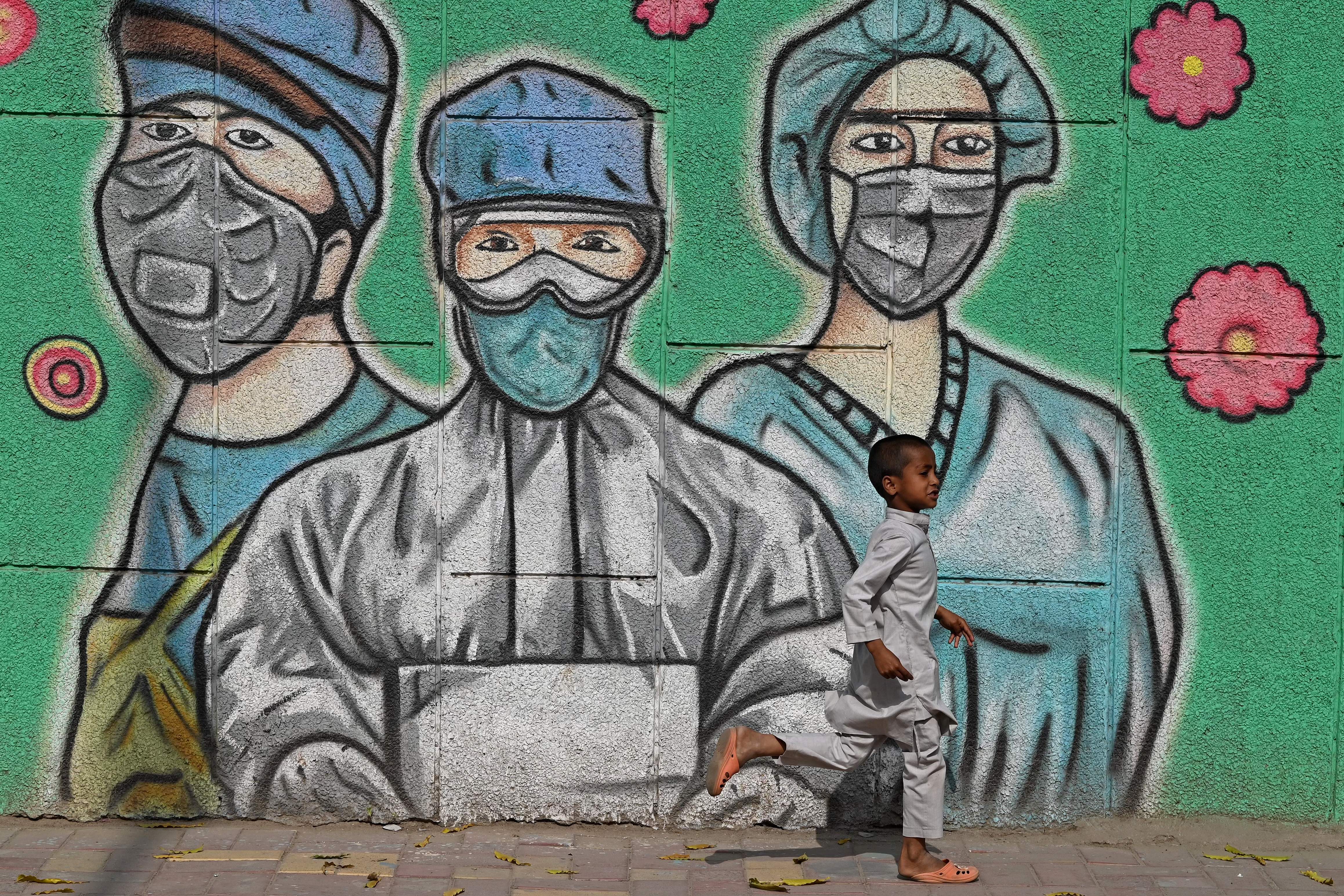 A child runs past a wall mural depicting healthcare workers wearing face masks along a road in New Delhi, India on March 21, 2021.