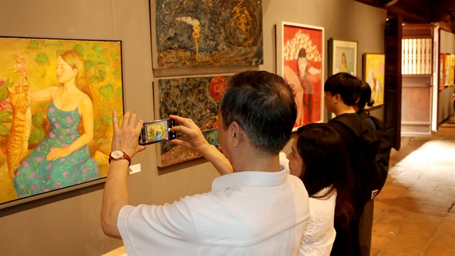 | Visitors contemplate paintings at the exhibition ‘Women Painting Women’. — Photos courtesy of Văn Miếu – Quốc Tử Giám Special National Relic Site |