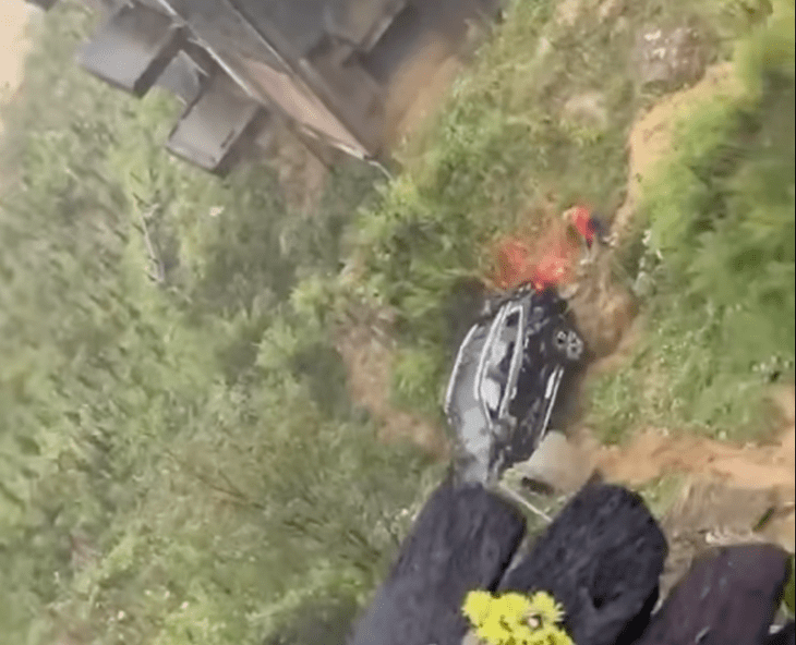 At around 5:08 p.m., a section of road leading to Cát Cát village suddenly gave way, with rocks and soil crashing down onto the roadway. Dashcam footage from a following vehicle captured the moment a black car was struck and pushed off the road, sliding down the slope.