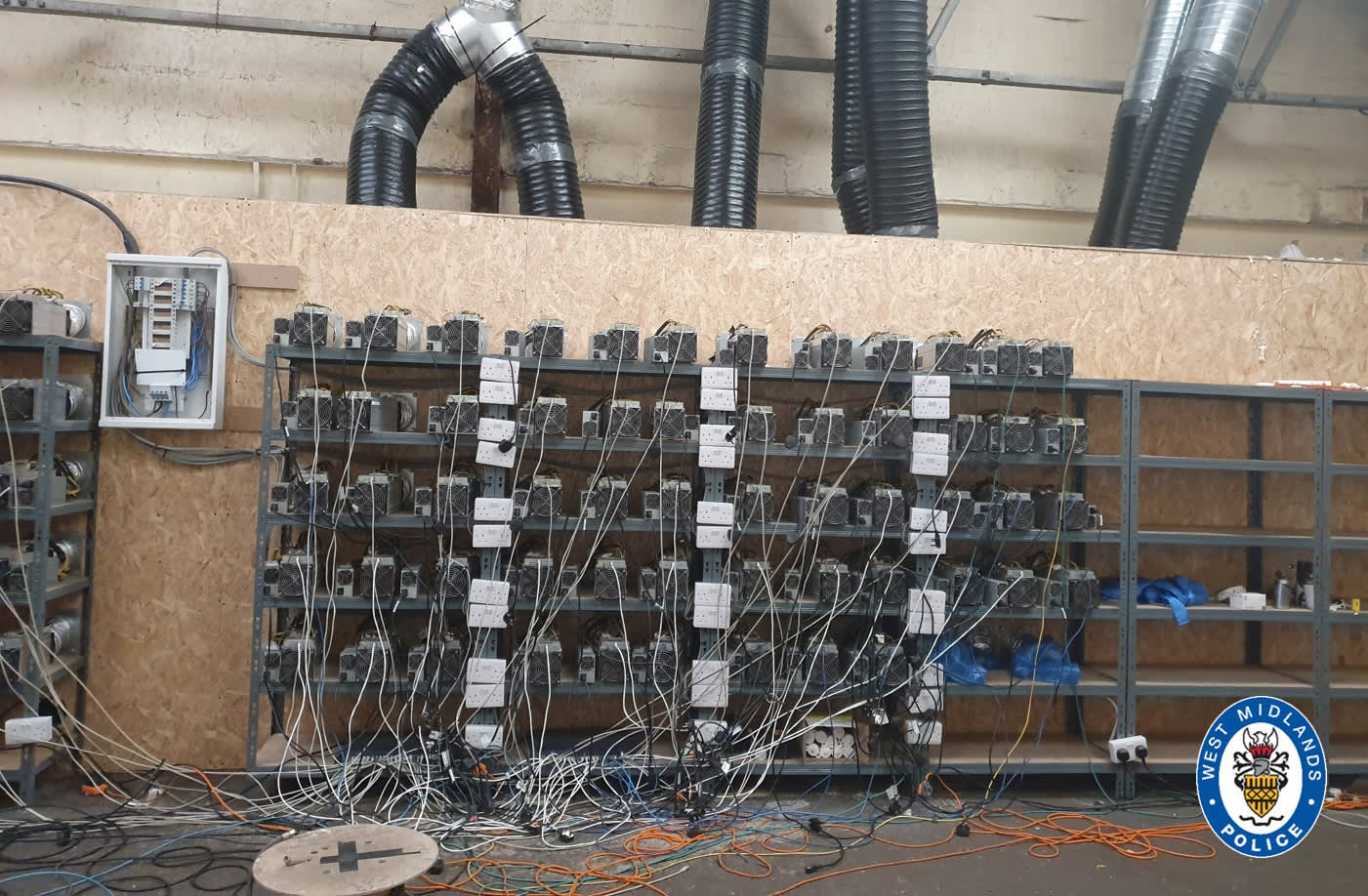 The mine — located in an industrial unit on the outskirts of the English city of Birmingham — was stealing thousands of pounds worth of electricity from the mains supply, West Midlands Police said Thursday.