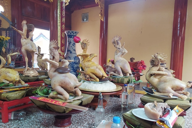 | CREATIVITY WITH FOOD: In Hà Tĩnh Province’s Lộc Hà Ward, families carefully arranged boiled roosters boiled roosters in dynamic poses — as if taking flight, perched atop sticky rice, balanced on their feet or laid out ceremonially. — Photo courtesy of Hà Tĩnh Newspaper |