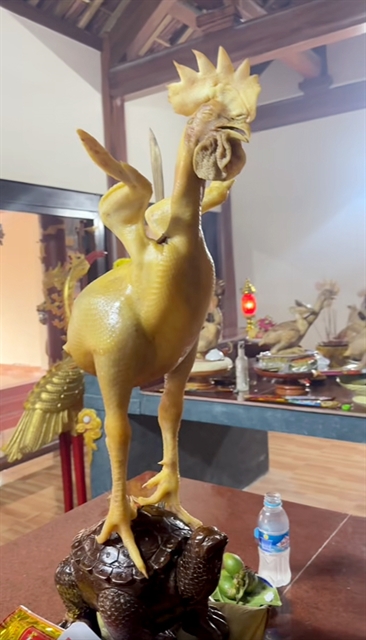 | RITUAL ROOSTER: A boiled ‘flying rooster’ is placed as an offering on the altar during special lunar-calendar rituals throughout the year. Only master chefs in Lộc Hà Ward, Hà Tĩnh Province, have perfected the craft of shaping a boiled rooster into a flight posture. — Photo courtesy of Hà Tĩnh newspaper |
