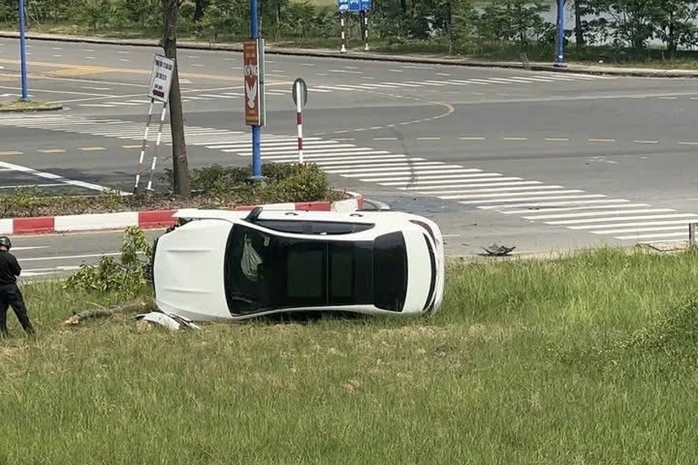 According to initial reports, the driver was crossing an intersection when the vehicle lost control, struck a roadside tree, and flipped onto a grassy area. The impact was strong enough to break the tree and deploy the vehicle’s airbags.