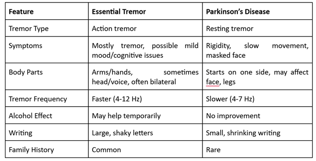 ET is the most common tremor disorder, marked by action tremors, shaking during voluntary movement or when holding a posture. It usually begins gradually and worsens over time. Most often affecting the arms and hands, it can also involve the head, voice or legs. Unlike Parkinson’s resting tremor, ET occurs during activity.