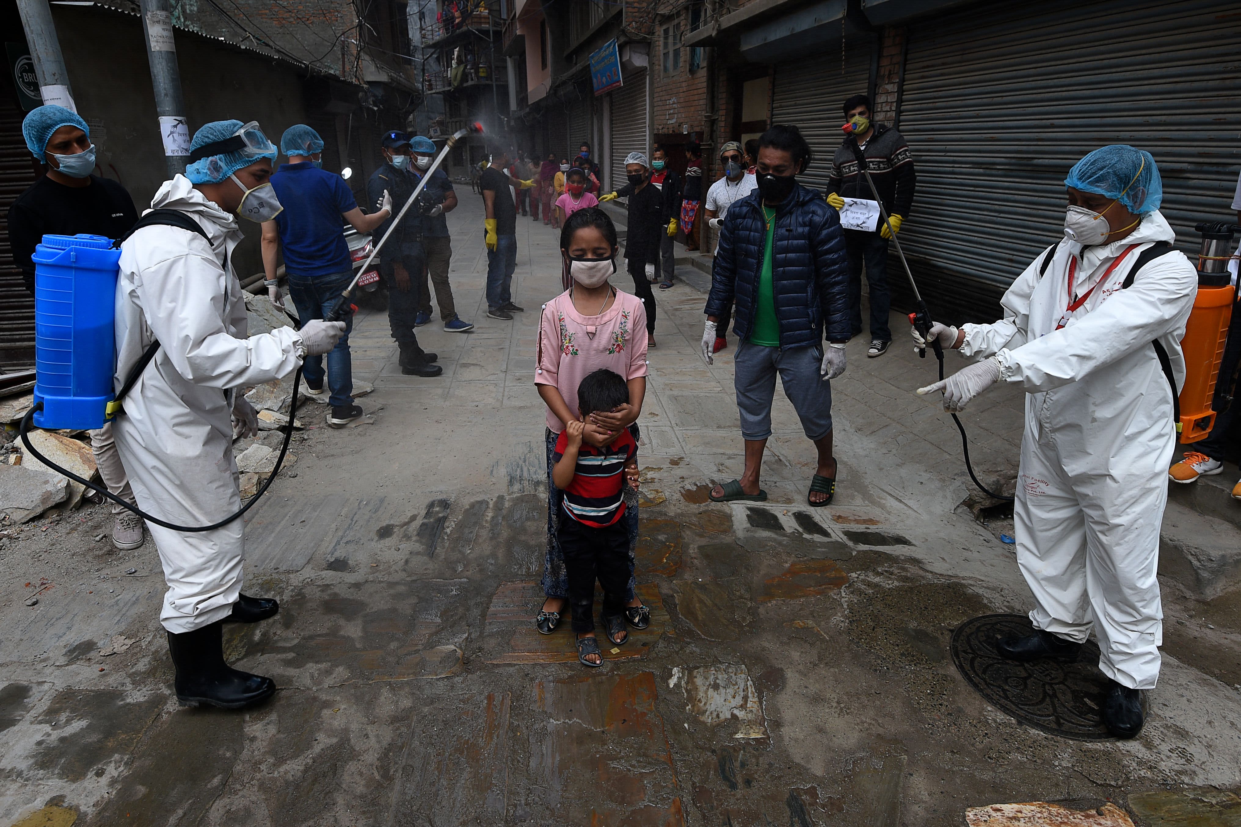 Health workers wearing protective suits spray disinfectant on children during a government-imposed nationwide lockdown as a preventive measure against the Covid-19 coronavirus, on a deserted road in Kathmandu on May 3, 2020.