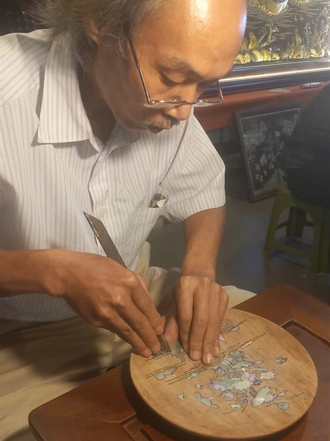 | An artisan from the Chuôn Ngọ Mother-of-Pearl Inlay Village works on a piece at the Hà Nội Old Quarter Cultural Exchange Centre. VNS Photo Thanh Hà |