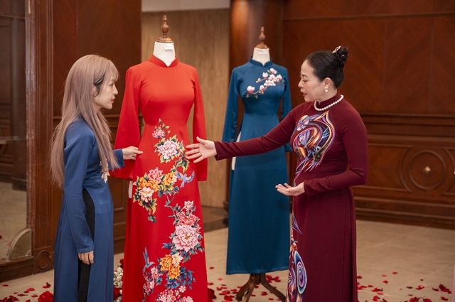 | Vietnamese designer Trần Phương Hoa (left) introduces the technique and material used to make áo dài. Photo courtesy of the designer |