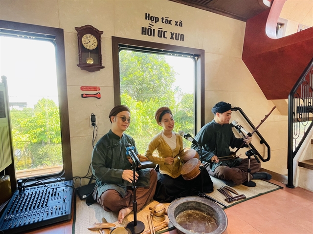 | Quan họ (love duet) singing is performed on the Hà Nội 5 Cửa Ô (Hà Nội’s Five Gates) train. — VNA/VNS Photo Tuyết Mai |