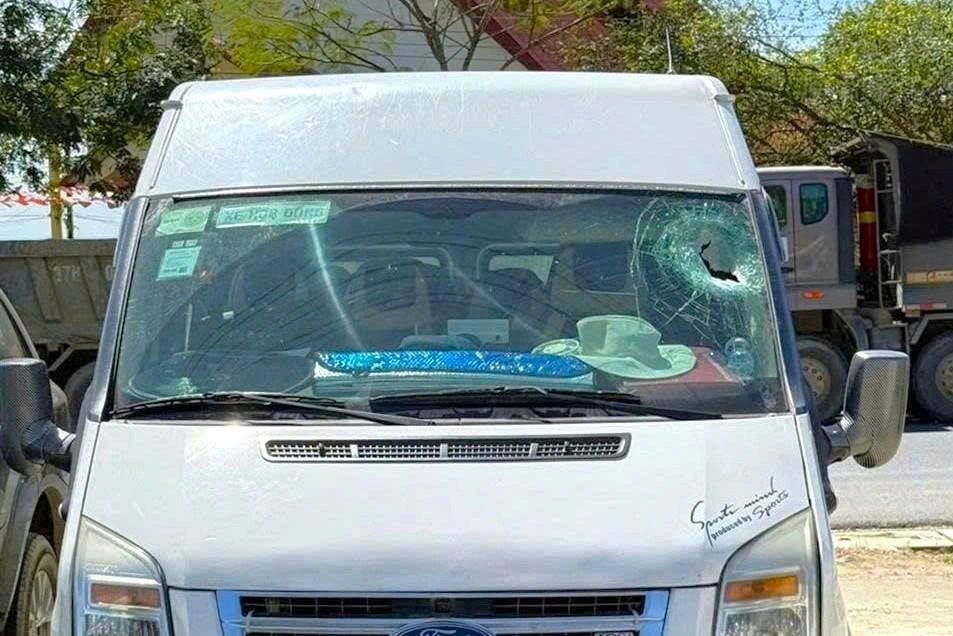 While driving through Phan Sơn Commune on the steep, under construction Đại Ninh Pass, a rock reportedly dropped from a dump truck ahead and pierced the van’s roof.
